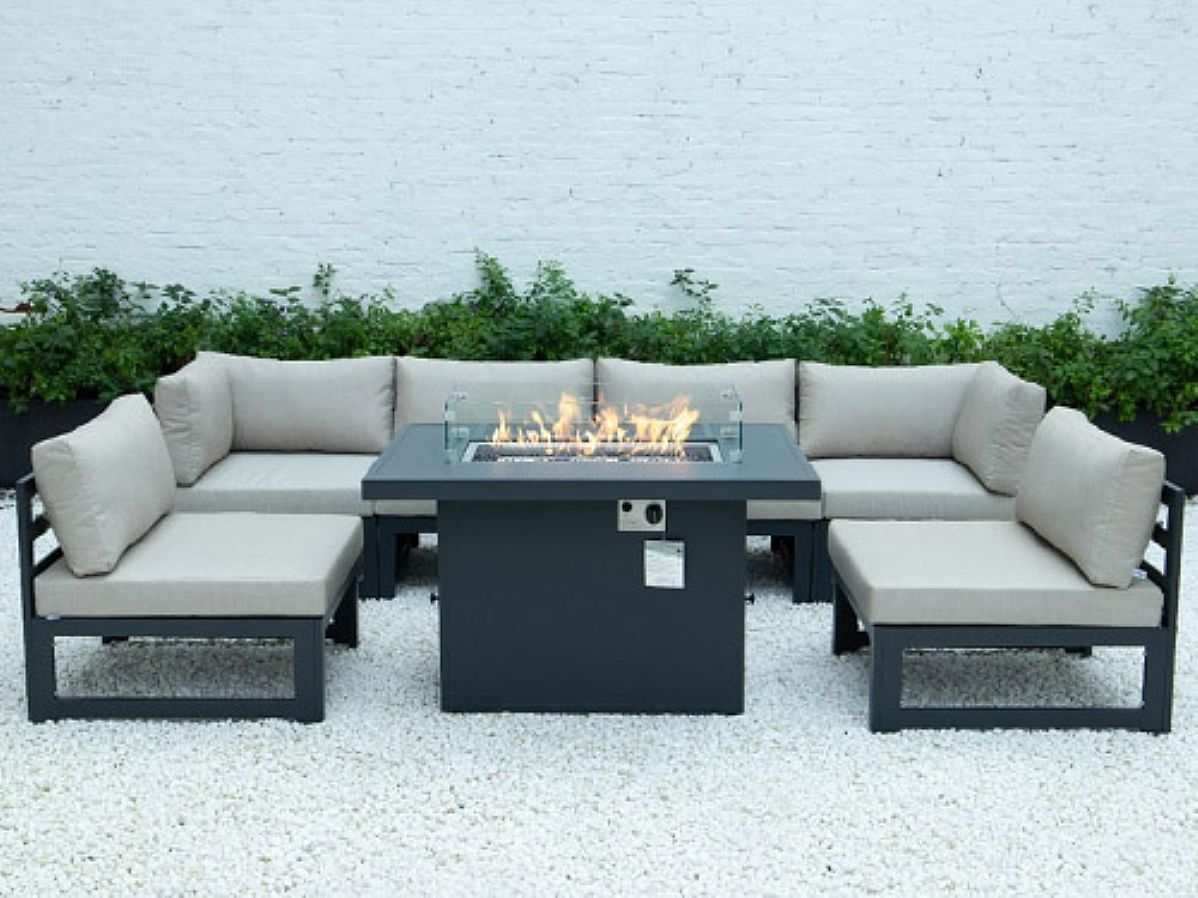 Para mayor comodidad y apoyo, las sillas incluyen reposabrazos de felpa y un respaldo curvo. El brasero se alimenta con un tanque de propano (no incluido), y la mesa está equipada con una cubierta de malla de seguridad y un protector contra chispas para mantenerla segura.