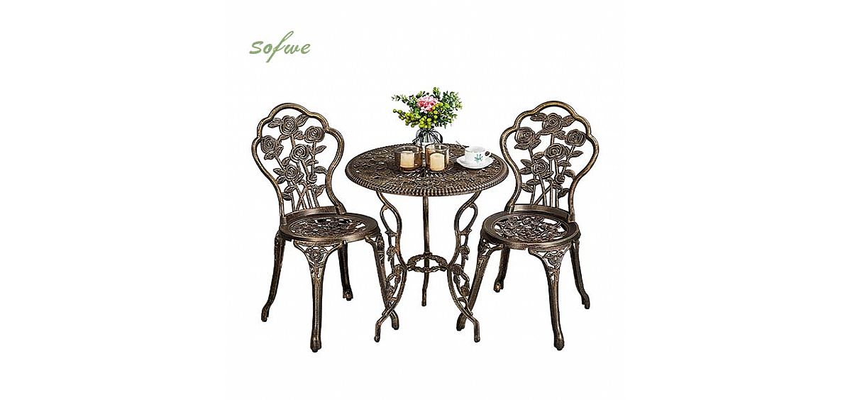 - Diseño floral único: Con su acabado en bronce antiguo y su diseño clásico tallado floral, este juego de mesa agrega un toque elegante a su espacio al aire libre. Los intrincados detalles del patrón floral crean una escena pintoresca que es a la vez sofisticada y encantadora, lo que lo convierte en un complemento perfecto para su porche o patio trasero.