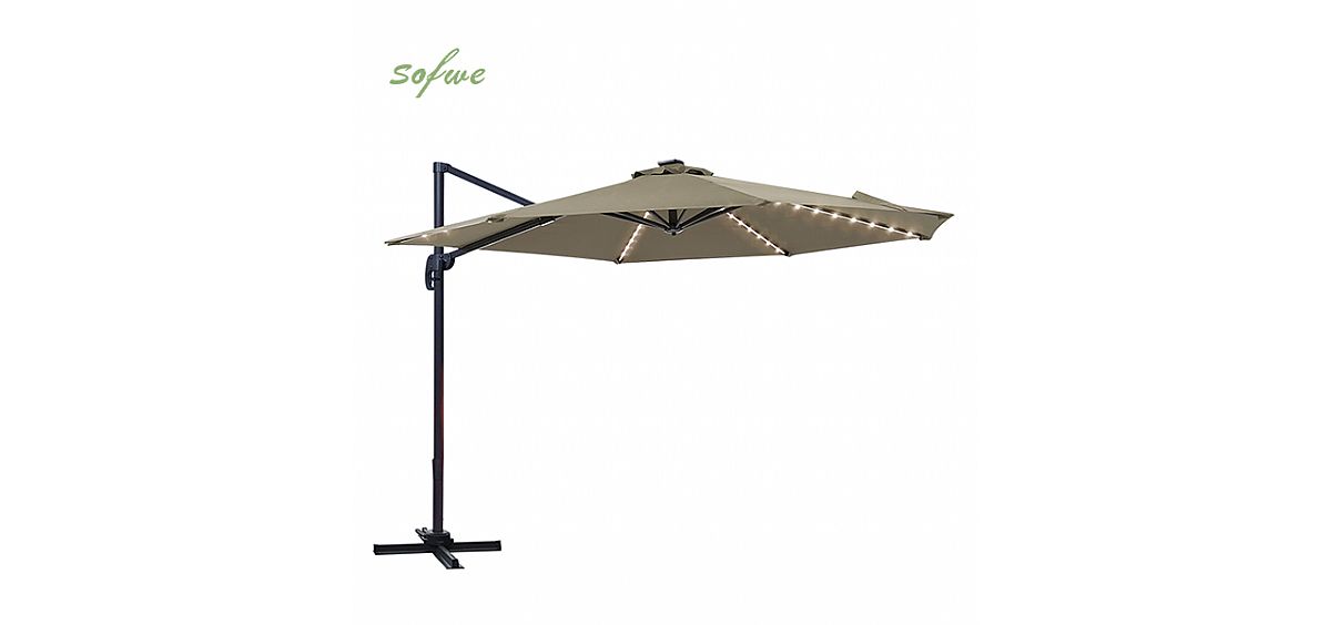 - Una sombrilla voladiza para patio ofrece una solución de sombra flexible. Las sombrillas compensadas maximizan la sombra independientemente de dónde se mueva el sol al girar manualmente 360 grados y ajustar la altura de la cubierta.